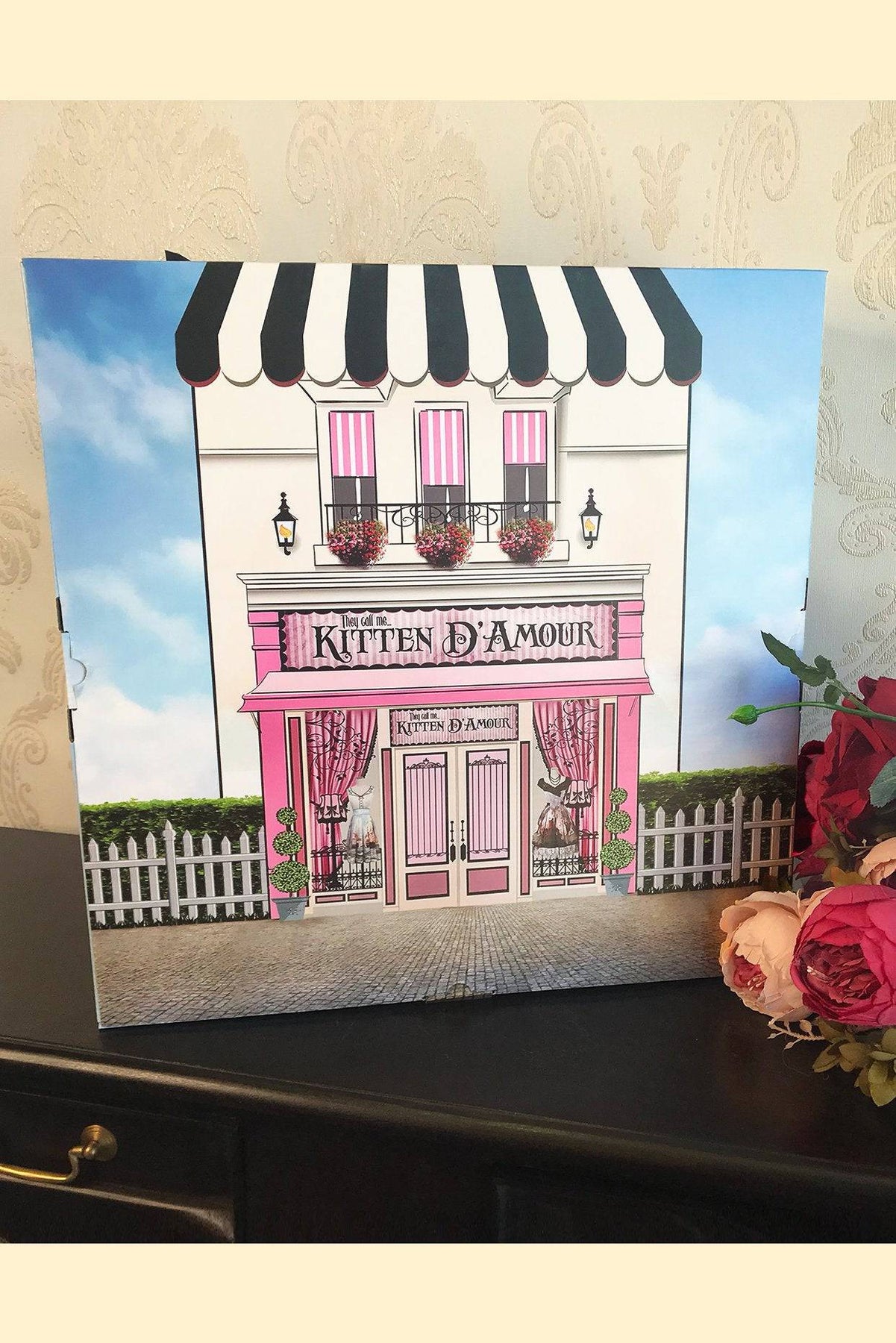 Each 'Venetian' Straw Hat will arrive safely in a generously sized Kitten D'Amour hat box. This hat box is adorned with the beautiful Kitten D'Amour 'Boutique Front' artwork, and makes for a very special way to protect and store your new straw hat!
