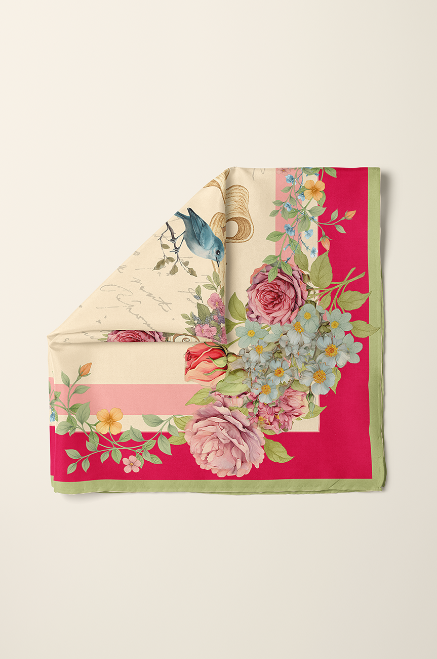 The Birdsong Scarf – Dawn Chorus Edition is a truly exquisite accessory, blending vintage style elegance with the charm of our exclusive Birdsong print. Designed in a striking raspberry red, cream and green background, this edition features the whimsical “They Call Me Kitten D’Amour” logo, alongside the three signature birds from the collection. Delicate floral motifs and flowing script elements complete this graceful design.