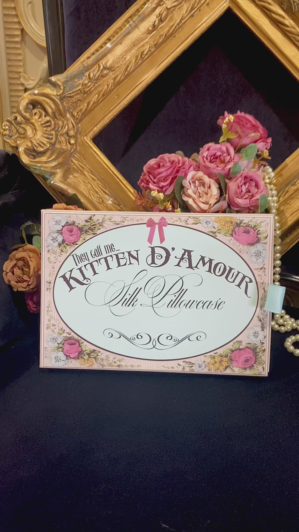 Each 'Marie Antoinette' 100% Silk Pillowcase will arrive in a darling keepsake box. This box has been thoughtfully decorated in true Kitten D'Amour fashion, featuring intricate floral details!